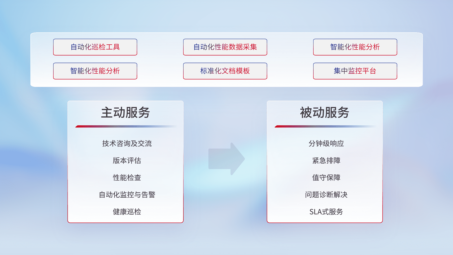 智能化工具和标准化文档,,,保障服务质量,,,提供主动服务(包含技术咨询、、版本评估、、、性能检查、、自动化监控与告警、、健康巡检)和被动服务包含(分钟级响应、、紧急排障、、、、值守保障、、、问题诊断解决、、、SLA服务)。。。。