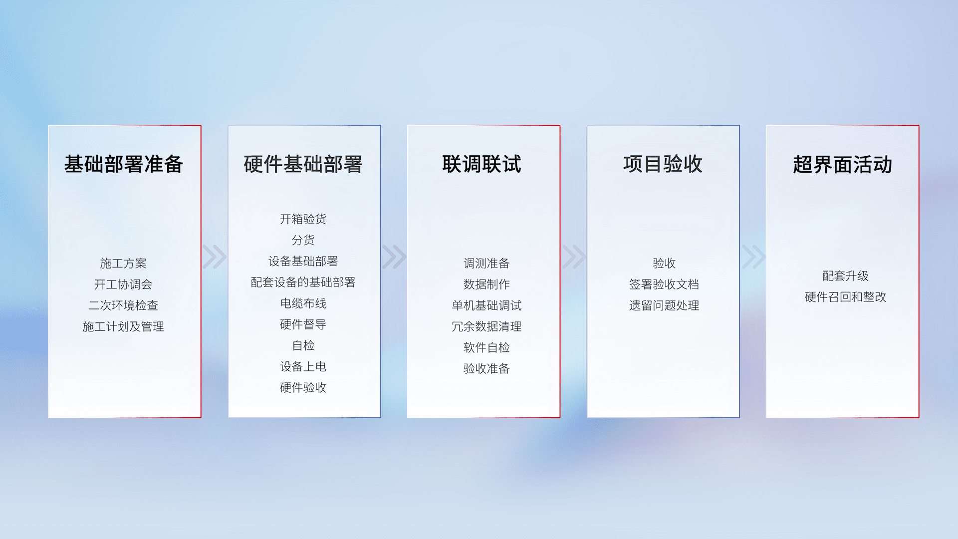 从基础部署准备、、硬件基础部署、、联调联试、、项目验收、、、越界面活动的全过程可追溯,,保证施工质量和进度。。。。